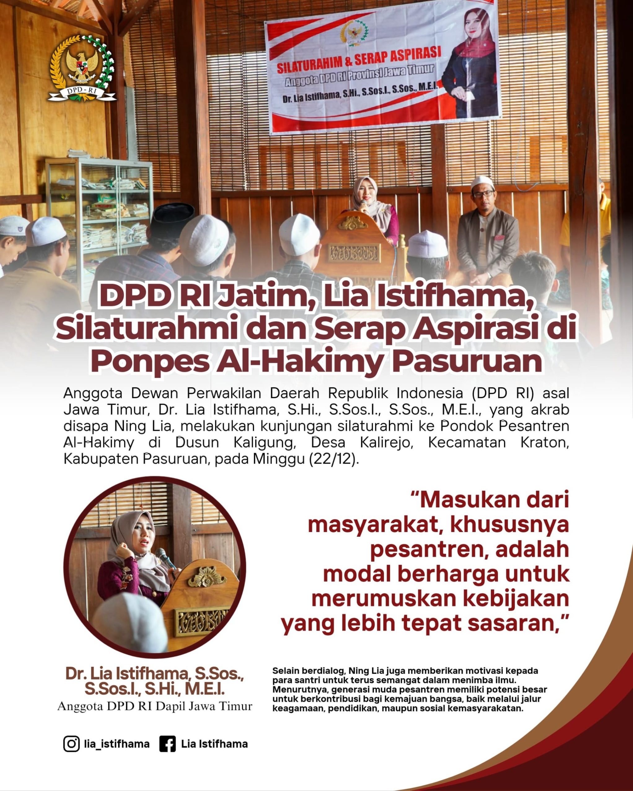 JATIMCETTAR.COM – PASURUAN, Anggota Dewan Perwakilan Daerah Republik Indonesia (DPD RI) asal Jawa Timur, Dr. Lia Istifhama, S.Hi., S.Sos.I., S.Sos., M.E.I., yang akrab disapa Ning Lia, melakukan kunjungan silaturahmi ke Pondok Pesantren Al-Hakimy di Dusun Kaligung, Desa Kalirejo, Kecamatan Kraton, Kabupaten Pasuruan, pada Minggu (22/12).