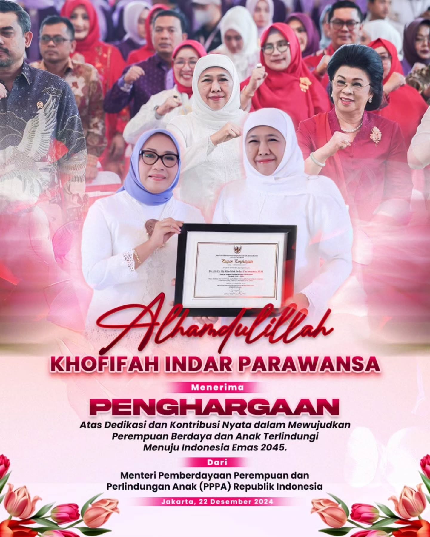 “Perempuan berdaya, anak terlindungi, menuju Indonesia Emas 2045 adalah tanggung jawab kita bersama. Mari kita jadikan momentum Hari Ibu ini sebagai penggerak perubahan positif,” kata Arifah.