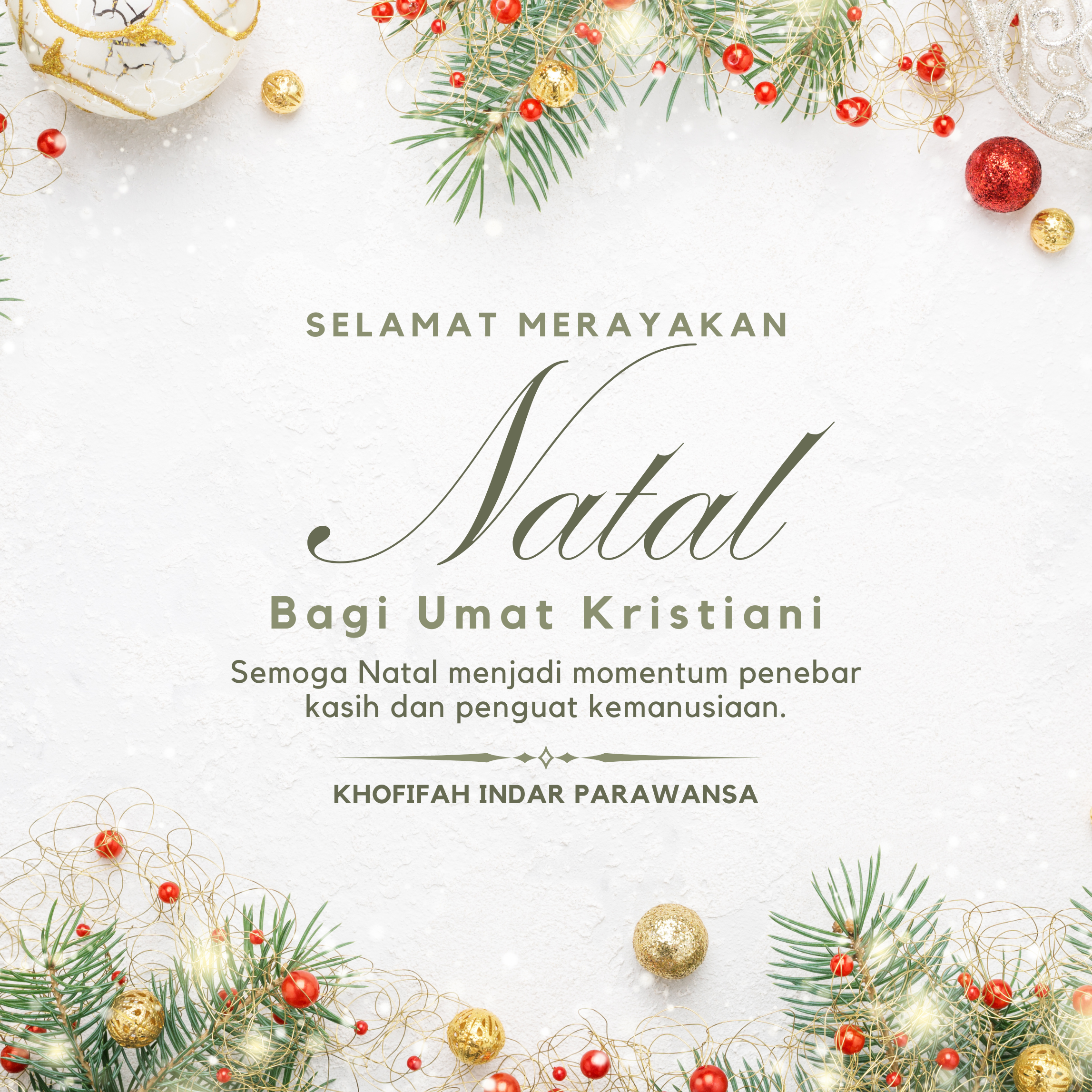 JATIMCETTAR.COM, SURABAYA – Kofifah Indar Parawansa mengucapkan selamat Natal kepada seluruh umat Kristiani di Jawa Timur dan Indonesia.